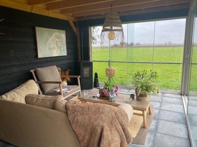 Na het installeren van de “werkplekken” en het afstemmen wie wanneer een overleg had, zijn we direct aan de slag gegaan. Ik werkte samen met één vriendin aan een ruimte eettafel met prettig zittende stoelen terwijl de andere vriendin haar plekje had gevonden in de overkapping die in de tuin stond. Deze overkapping was omringd door glazen schuifdeuren, had een palletkachel en een heel fijne bank. Ideaal wanneer en bijvoorbeeld een webinar, masterclass of een zoomcall hebt. Ook hadden we een prachtig uitzicht over de weilanden en met een beetje geluk kwamen de schapen ons gedag zeggen.